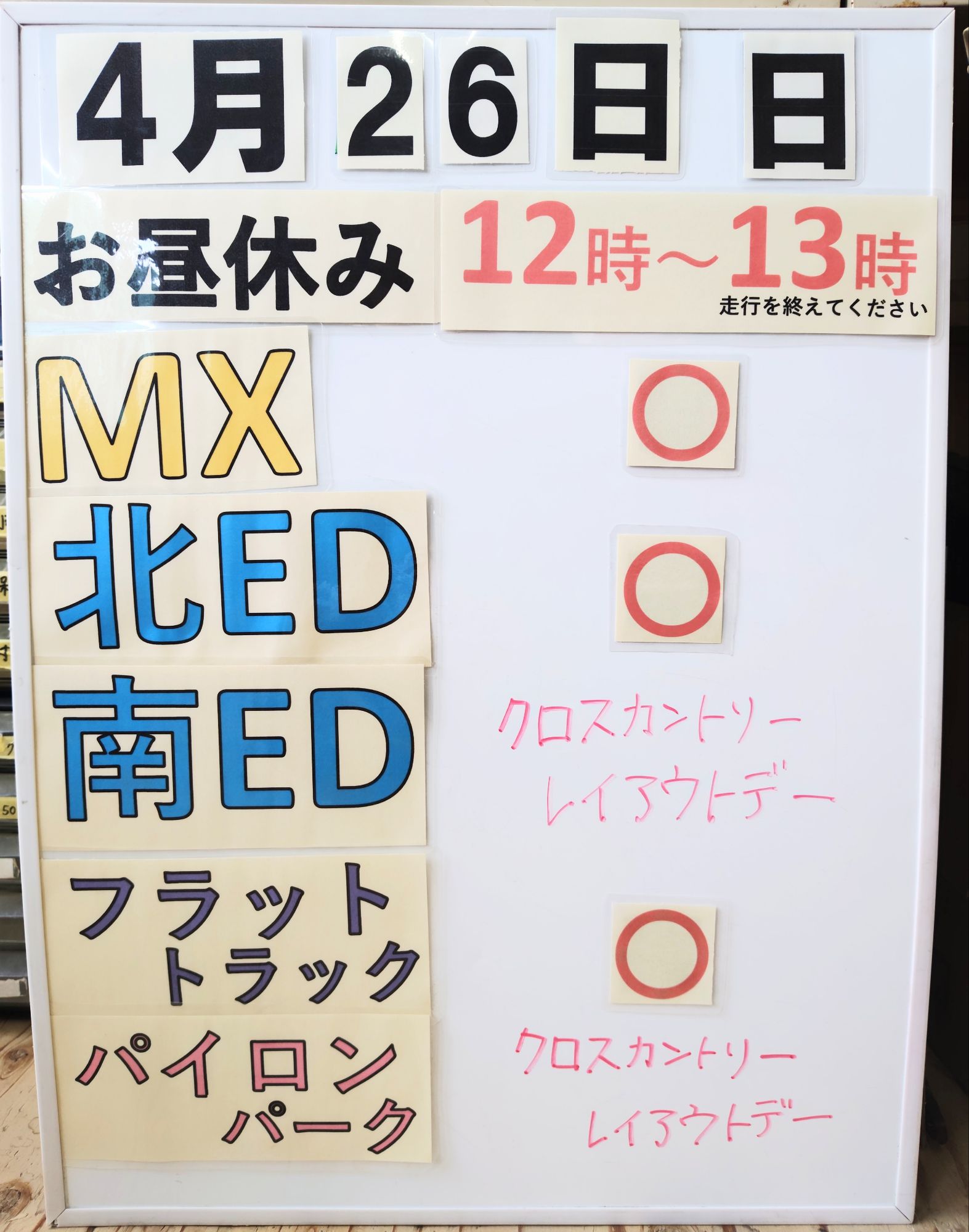26’4/9~南エリア重機出入りします 走行時はご注意ください コース各所雨の影響で斜面が崩れやすくなっております モトクロスコース駐車場下、救護導線上ののりめんは立ち入らないようにご協力お願いします 形が崩れ、亀裂が入り土砂崩れにつながります (続きを読む)